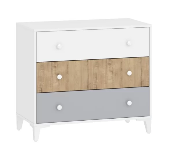 Комод «Морти» - прекрасный выбор для интерьера в стиле Современный, Модерн, Скандинавский. Три удобных выдвижных ящика станут вместительным место для хранения белья, предметов одежды и аксессуаров. В оттеночной гамме мебели царит стильное сочетание современности, изюминкой модели являются цвета ящиков: белый, серый и дуб бунратти. Выдвижные ящики оснащены шариковыми направляющими полного выдвижения, равномерно распределяют вес содержимого и обеспечивают плавный бесшумный ход ящика. Высокие опоры зрительно облегчают конструкцию и более удобны для уборки.