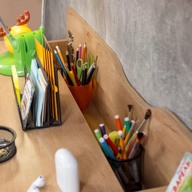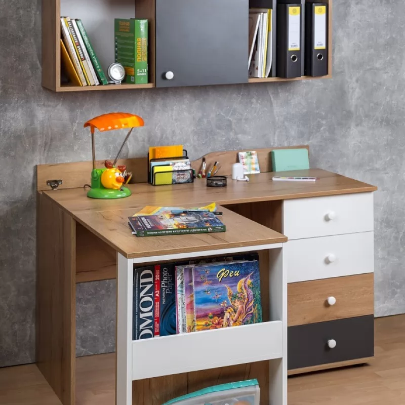 84 Стол письменный отличается нестандартным решением для столешницы, которая максимально адаптирована для потребностей современных детей и работе на компьютере. Под откидной её частью, которая открывается за плавный вырез, прячется ниша для хранения и отверстие с заглушкой для вывода проводов, чтобы они не запутывались и не мешали ребенку. Если ребенок ещё не занимается за компьютером, то нишу можно использовать и для размещения органайзеров с карандашами, фломастерами и красками, чтобы они не отвлекали от творчества. Дополняют стол ящики на шариковых направляющих. За счет просторной рабочей поверхности, а также возможности левосторонней и правосторонней сборки 84 Стол письменный одинаково удобен как для левши, так и для правши. Письменный стол входит в программу Ширина ВРАЗМЕР, а это значит, что его ширину можно увеличивать и уменьшать на 150 мм с шагом в 1 мм. Таким образом, он легко подстроится под планировку вашей комнаты.