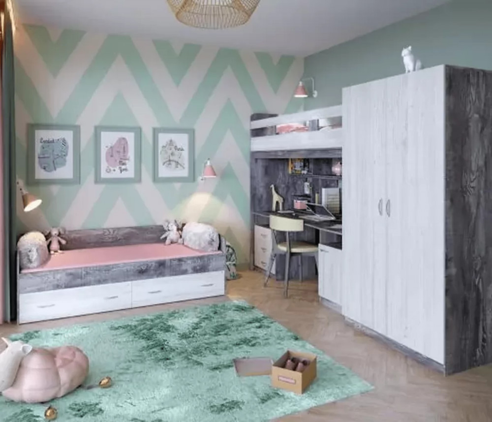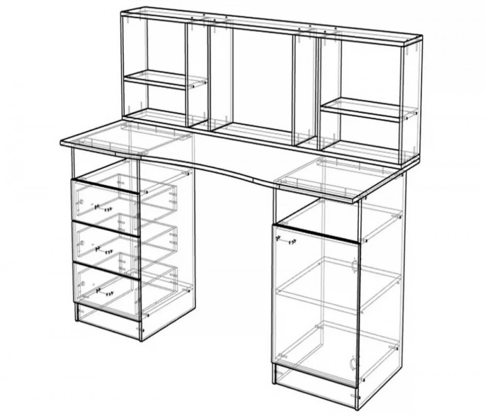 — В столе тумба с тремя выдвижными ящиками, в тумбочке за дверкой полка;