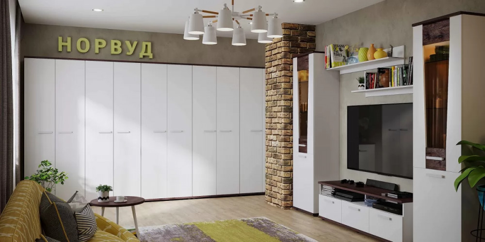 Основной декор гостиной НОРВУД — белый. Именно он отвечает за визуальное расширение пространства и освещение. Контрастные горизонтальные поверхности толщиной 22 мм в декоре Орех Шоколадный разбавляют белые фасады модулей.