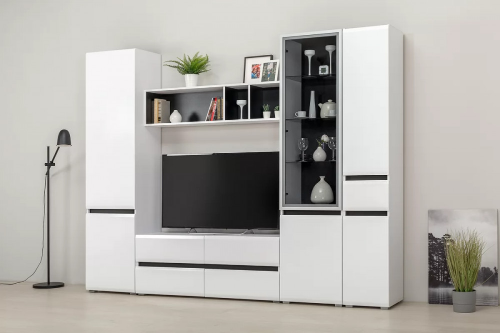 Лаконичные белые глянцевые фасады создают ощущение чистоты и свежести, лёгкости, свободного пространства. Акцентом выступают чёрные горизонтальные вставки между фасадами и серое тонированное стекло витрины. Фасады могут открываться за край, либо нажатием, с помощью механизма push-to-open. Все распашные фасады оснащены доводчиками, что обеспечивает плавное закрывание и исключает удар о корпус. Полка крепится к боковинам соседних модулей, собираю всю компоновку в единое целое. Задняя стенка чёрного цвета эффектно подчеркивает наполнение шкафов.