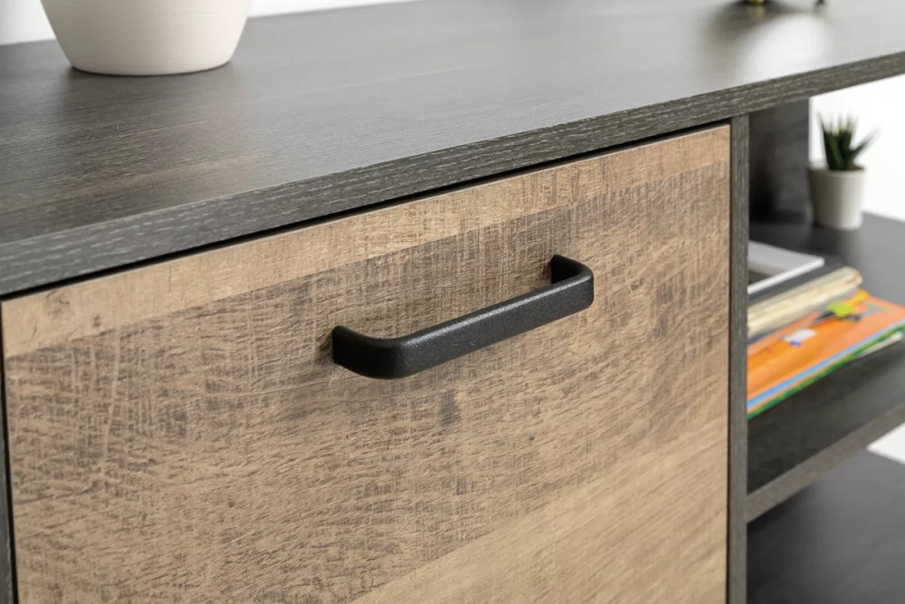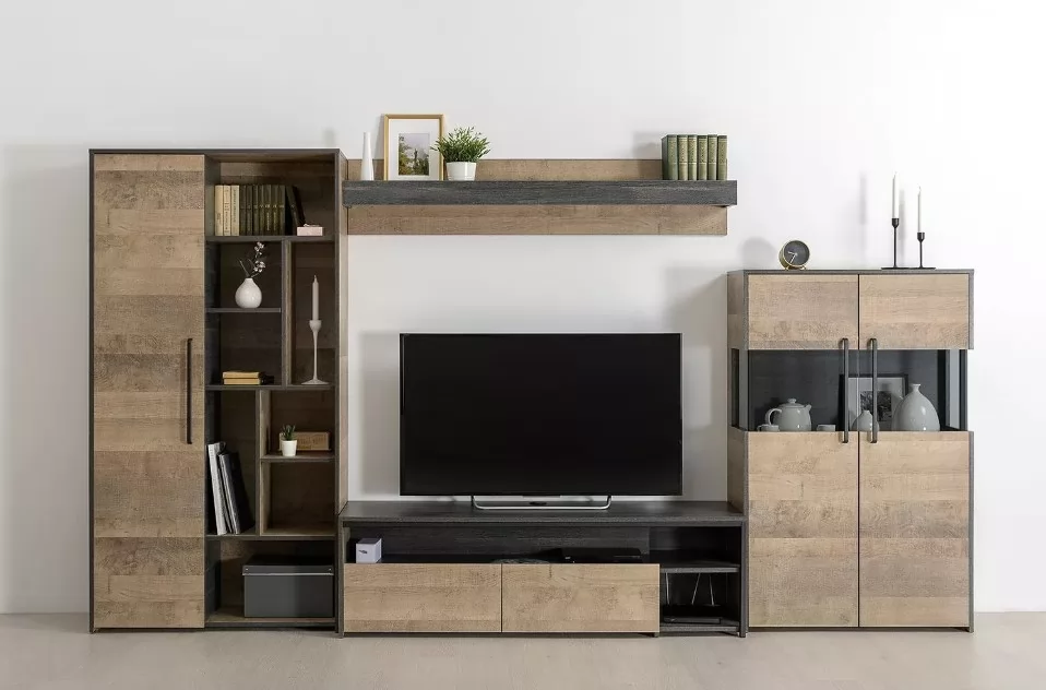 Индустриальная гостиная в стиле лофт. Все петли и направляющие оснащены доводчиками, что несомненно сделает ежедневное пользование приятным и безопасным. Металлические стойки с регулируемыми опорами делают эту мебель надёжной, аутентичной и функциональной. Лицевая фурнитура с тем же покрытием придаёт мебели индустриальную эстетику. Светодиодная подсветка в витринах с тонированным стеклом — эффектно подчёркивает аксессуары.