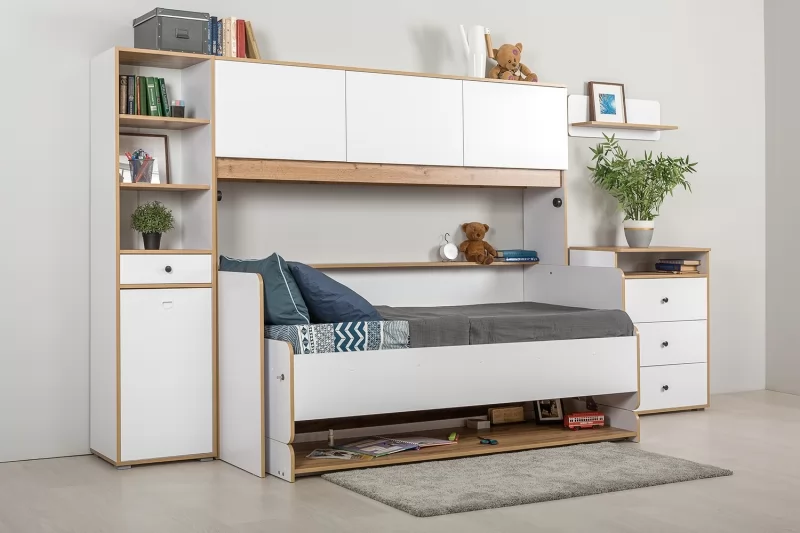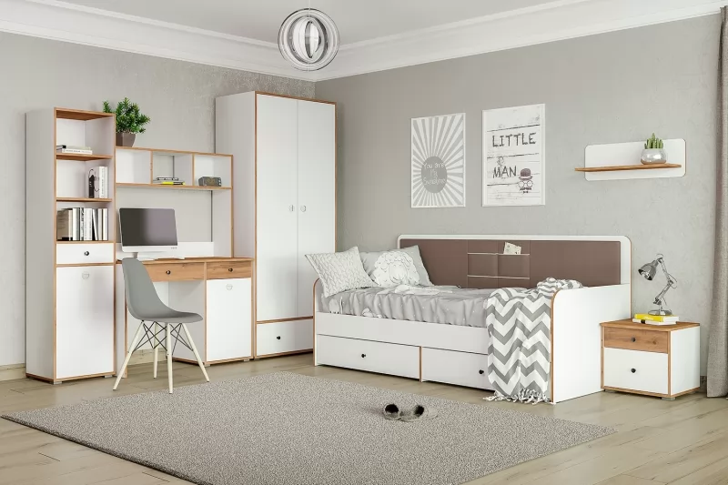 Светлая и аккуратная молодёжная мебель. Основой модульной системы является кровать-трансформер. Её столешница имеет постоянный горизонт, то есть при трансформации не нужно убирать вещи. Система хранения с подъёмными фасадами значительно расширяет функционал. Также имеются письменный стол с надстройкой и полкой, шкафная группа и комод с тумбочкой. Вместе они позволяют создавать разноразмерные композиции, примеры которых - на фото слева.