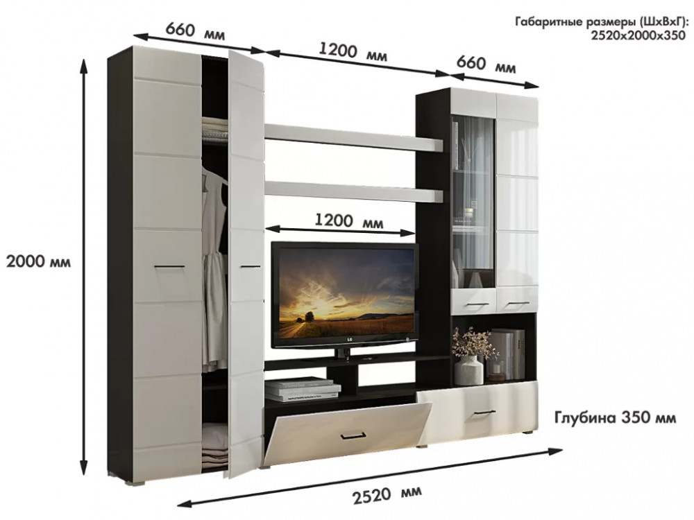 Размеры ниши под ТВ (ВхШхГ), мм: 1200х895