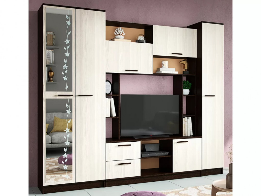 Гостиная «Флора» невероятно вместительный вариант. В ней вы сможете расположить телевизор, всю необходимую аудиотехнику, а верхние и нижние ящики прекрасно подойдут для документов и личных вещей. Кроме того, модель гостиной Флора имеет два полноценных шкафа, один из которых двустворчатый и оснащен штангой для вешалок с вашей одеждой.