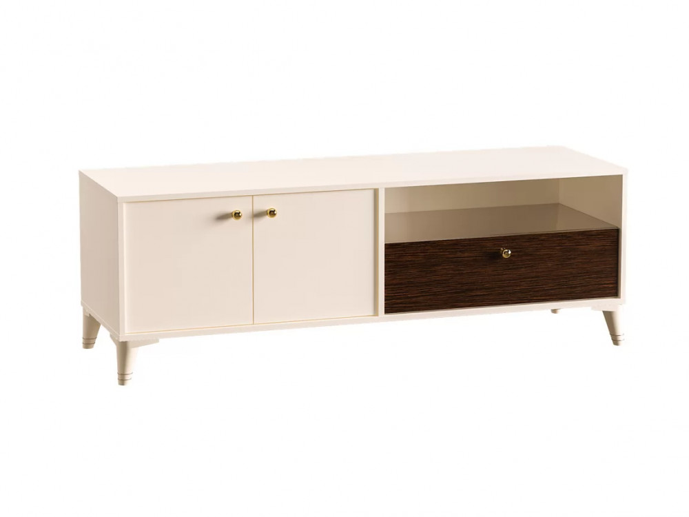 Тумба ТВ "Миндаль" №13.260 включает в себя вместительную секцию за распашными дверцами, выдвижной ящик и открытую нишу.