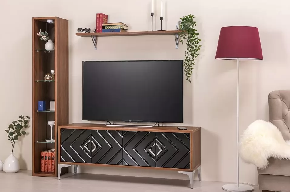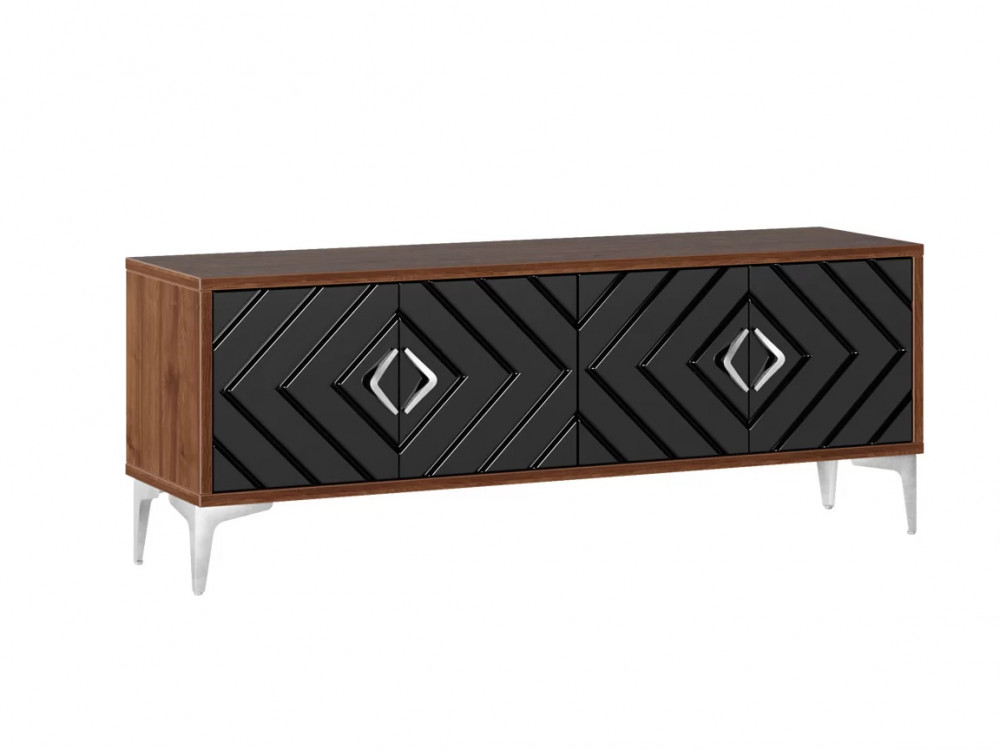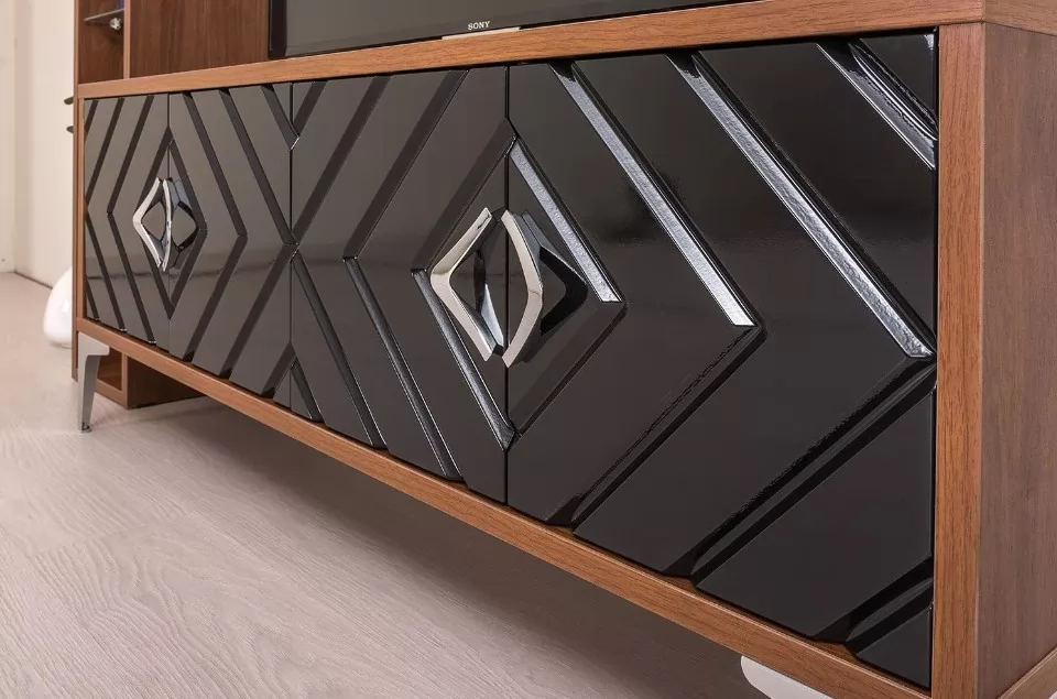 Тумба ТВ из модульной коллекции "Муар" - компактное и стильное решение для гостиной. Глянцевые фасады и древесный декор эффектно дополняются глянцевой металлической фурнитурой. Диагональный рисунок фрезеровки делает модель современной и динамичной.