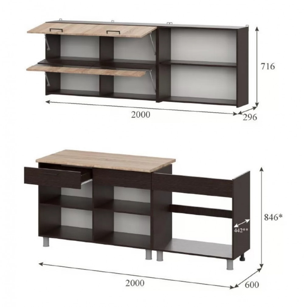 Размеры (см): ширина - 200, высота - 214, глубина - 60.Материал: ЛДСП.Цвет: венге, дуб сонома.Стиль: современный.Особенности:Готовая кухня Босфор выполнена в красивом контрастном сочетании цветов дуб венге и дуб сонома, что позволяет ей гармонично вписаться в любой интерьер.Кухонный гарнитур состоит из двух навесных шкафов шириной 80 см и 120 см и также двух напольных модулей шириной 80 см и 120 см соответственно.Верхний шкаф 80 см оснащен двумя полками и двустворчатым фасадом, 120 см - с двумя горизонтальными откидными фасадами и 4-мя полками.Напольный шкаф 80 см без столешницы рассчитан под мойку и его открытая задняя стенка удобна для монтажа необходимых коммуникаций.Напольный шкаф 120 см со столешницей толщиной 26 мм и выдвижным ящиком на шариковых направляющих подойдет для организации рабочей зоны на кухне.На фасадах навесных шкафов отсутствуют фурнитура (кроме верхней горизонтальной створки) и открываются за нижний торец.На фасадах напольных шкафов установлены стильные ручки-скобы.Гарнитур изготовлен из ЛДСП, этот материал прост в уходе, обладает высокой устойчивостью к механическим воздействиям.Регулируемые опоры позволяют надежно установить напольный модуль на любой поверхности.Смеситель и мойка в комплектацию не входят, приобретаются отдельно.Реальный цвет товара может отличаться от цвета товара на фотографии.Объем товара (м3): 0,22.Производитель: Россия.Вес: 113 кг.Количество упаковок: 6.
