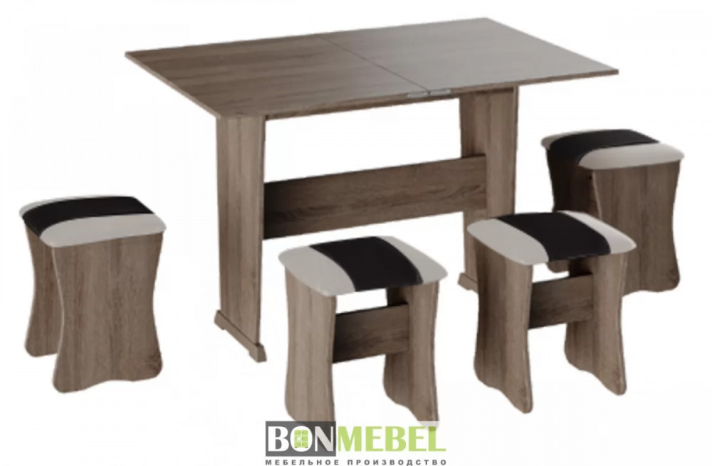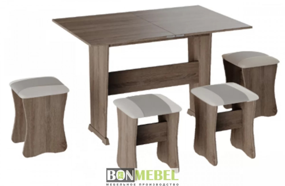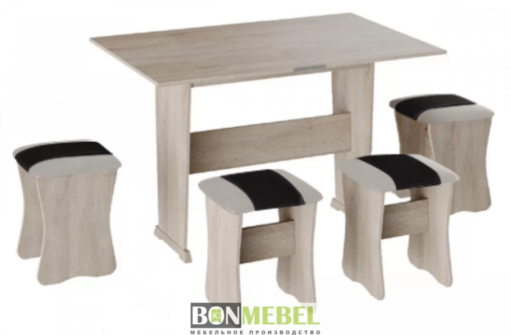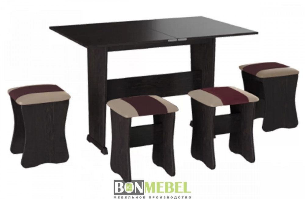 Обеденная группа с табуретами Тип-3 поможет стильно и практично оформить пространство даже на малогабаритной кухне. Комплект рассчитан на четыре персоны. Раскладной стол позволит увеличить ширину стола почти на 40 см за считанные секунды. Обивка из экокожи устойчива к различным загрязнениям и не требует обработки специальными средствами. Мягкие сиденья табуретов имеют мягкое и упругое наполнение, что повышает уровень комфортабельности. Различные варианты расцветки помогут подобрать идеальный комплект. Для изготовления изделий используется прочная ЛДСП. Обивка табуретов выполнена из искусственной кожи.