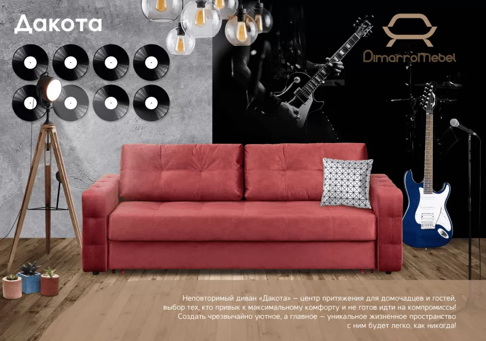 Диван "Дакота-2" создан в минималистичном стиле, это позволяет вписать его в различные интерьеры. Модель легко и просто раскладывается, превращаясь в двуспальную кровать, за счет проверенного временем механизма "Пантограф" на металлокаркасе. Мягкие приспинные подушки обеспечивают комфортную глубину посадки и хорошую поддержку спины.