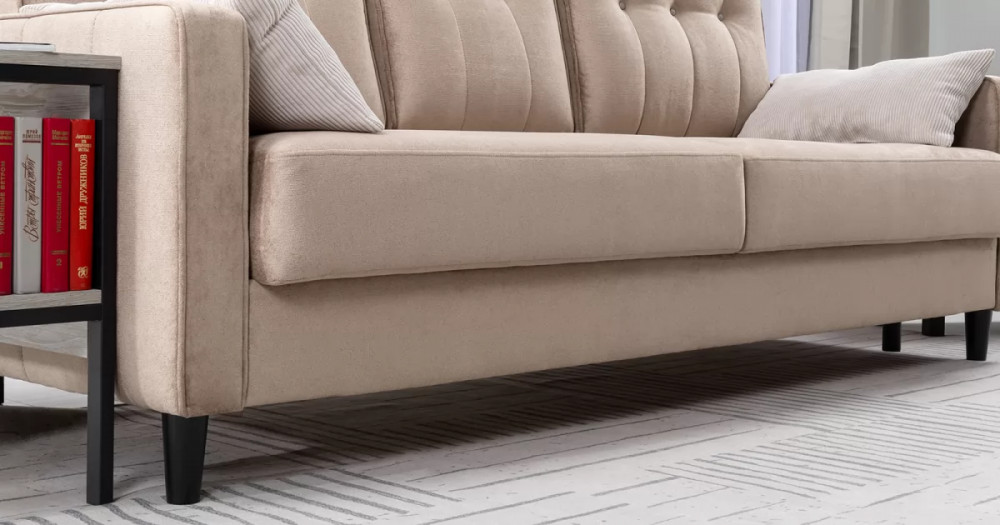 Подушки имеют трапециевидную форму, с утолщением к низу для комфорта посадки. Кант по всему периметру подушек, декоративные утяжки металлическими пуговицами, вертикальная стежка.