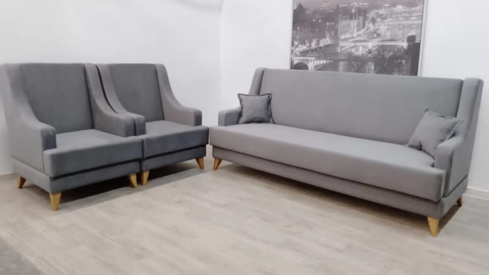 Описание дивана: Каркас - древесина хвойных пород Способ раскладки - "Книжка" Бельевой короб - ЛДСП Спинка, сиденье- независимый пружинный блок 120 мм, ППУ высокой плотности 30 мм Обивка - под заказ Опоры - пластиковые изделия Габариты- 2100*980*800 Спальное место - 1900*1200 Размеры кресла: 750*850*1020 Объем - 2,8 м3