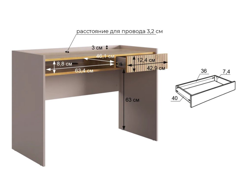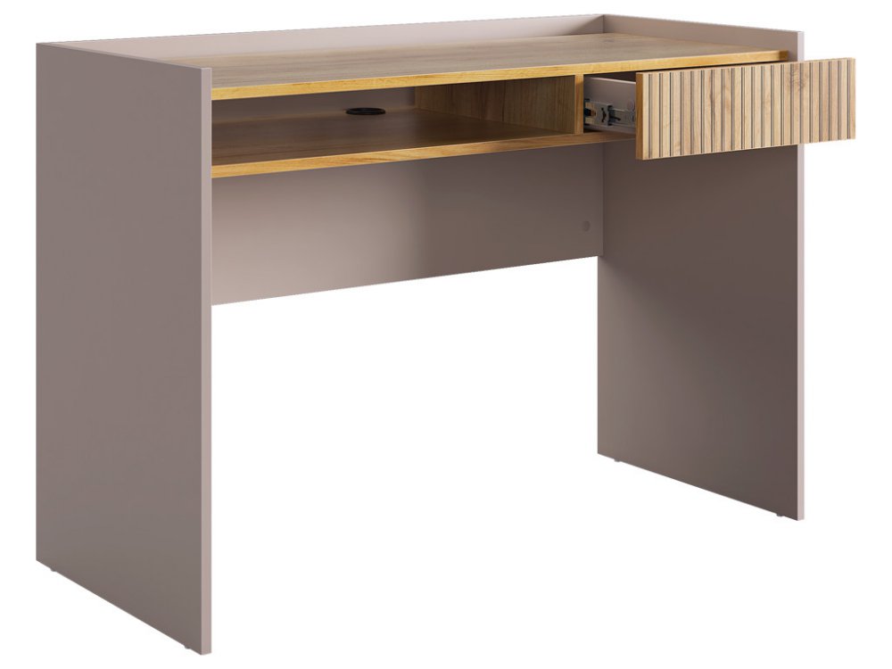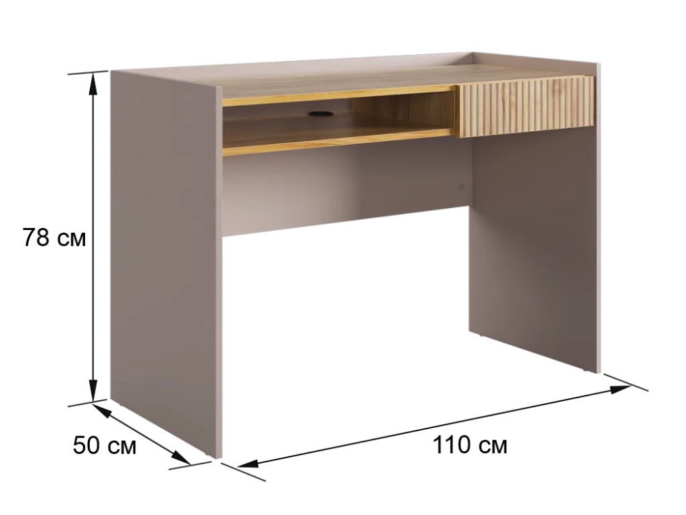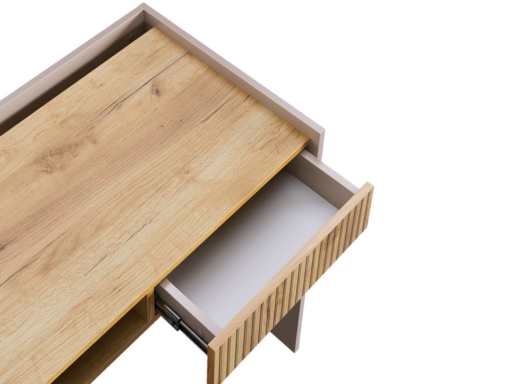 Корпус стола выполнен в цвете кашемир, что придает ему современный и спокойный вид, легко сочетающийся с любым интерьером. Выкатной ящик в цвете "дуб крафт золотой", декорирован принтом, имитирующим вертикальную фрезеровку, что добавляет столу уникальности и роскоши.