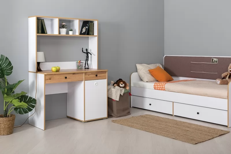 Светлая и аккуратная молодёжная мебель. Основой модульной системы является кровать-трансформер. Её столешница имеет постоянный горизонт, то есть при трансформации не нужно убирать вещи. Система хранения с подъёмными фасадами значительно расширяет функционал.