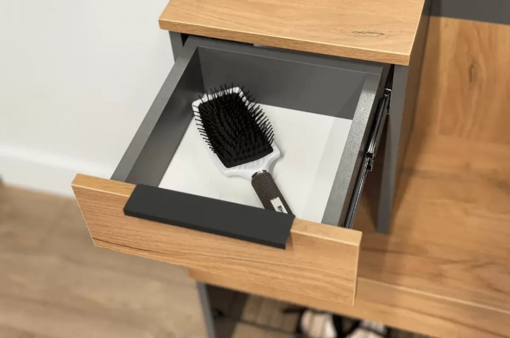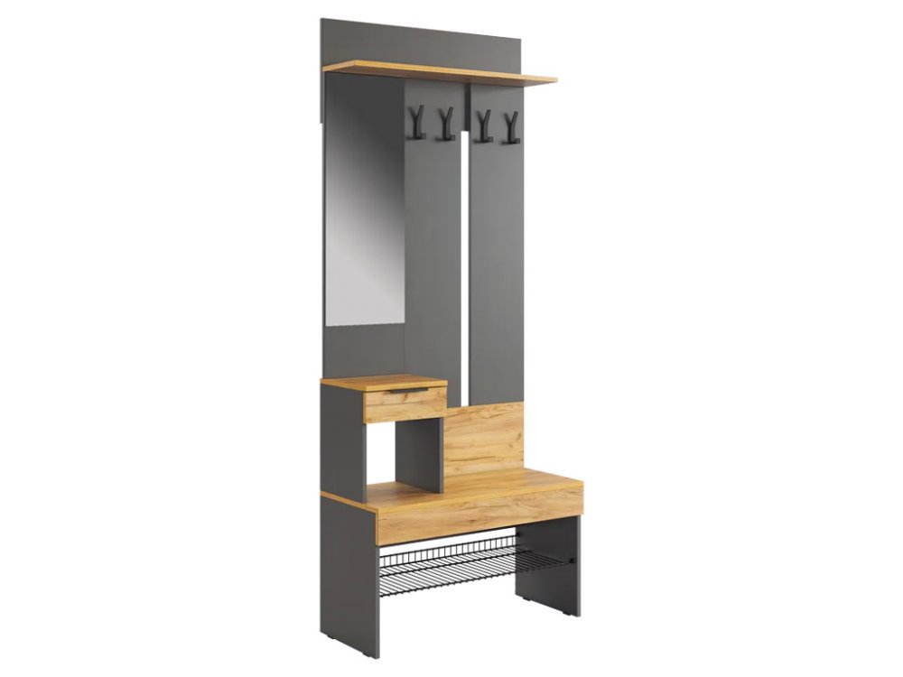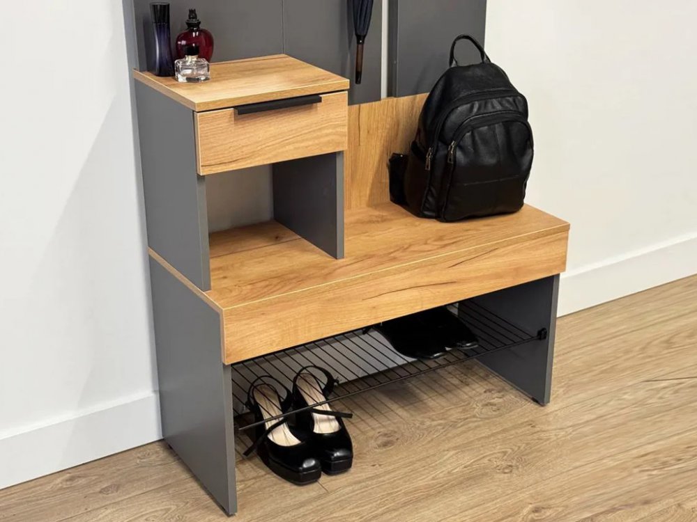 Крючки для одежды обеспечивают удобное место для размещения верхней одежды и аксессуаров, а выкатной ящик предоставляет дополнительное пространство для хранения мелочей. Сетчатая полка для обуви позволяет аккуратно разместить обувь, обеспечивая вентиляцию и легкий доступ.