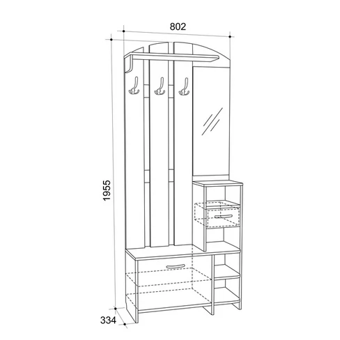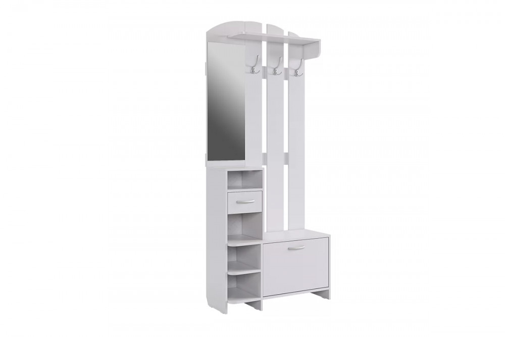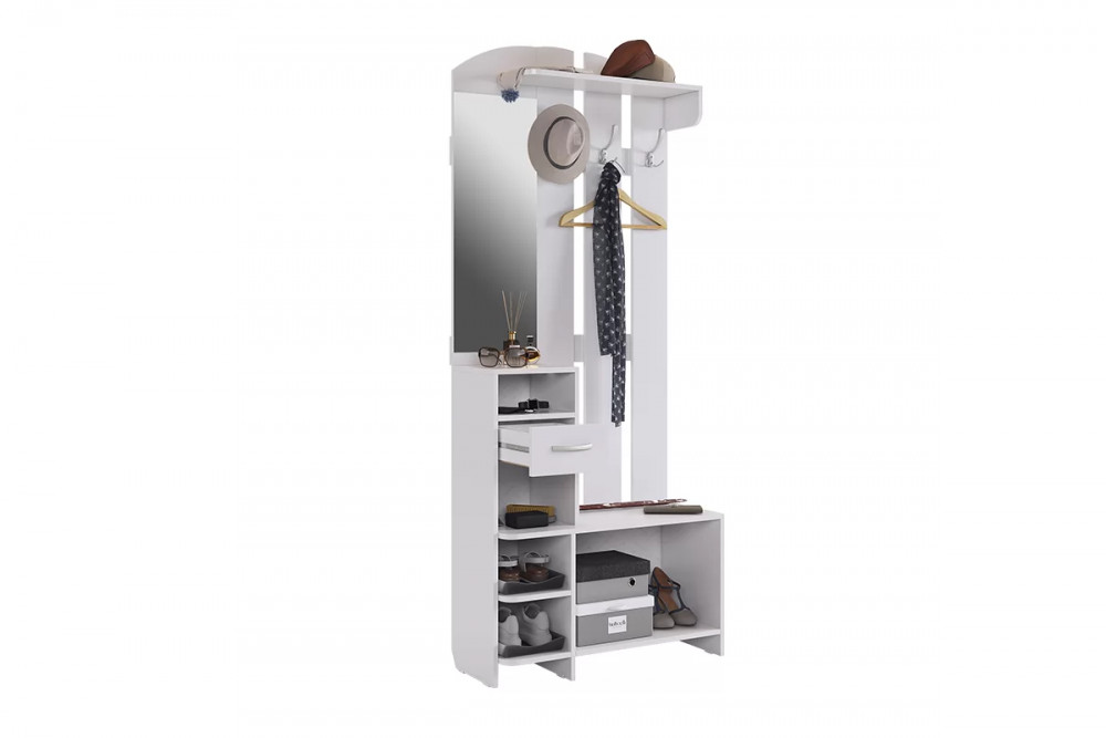 Состоит из: полок, вешалки с крючками для одежды и сумок, обувницы, открытых полок, зеркала, полки для головных уборов, выдвижного ящика. Сборка универсальная.