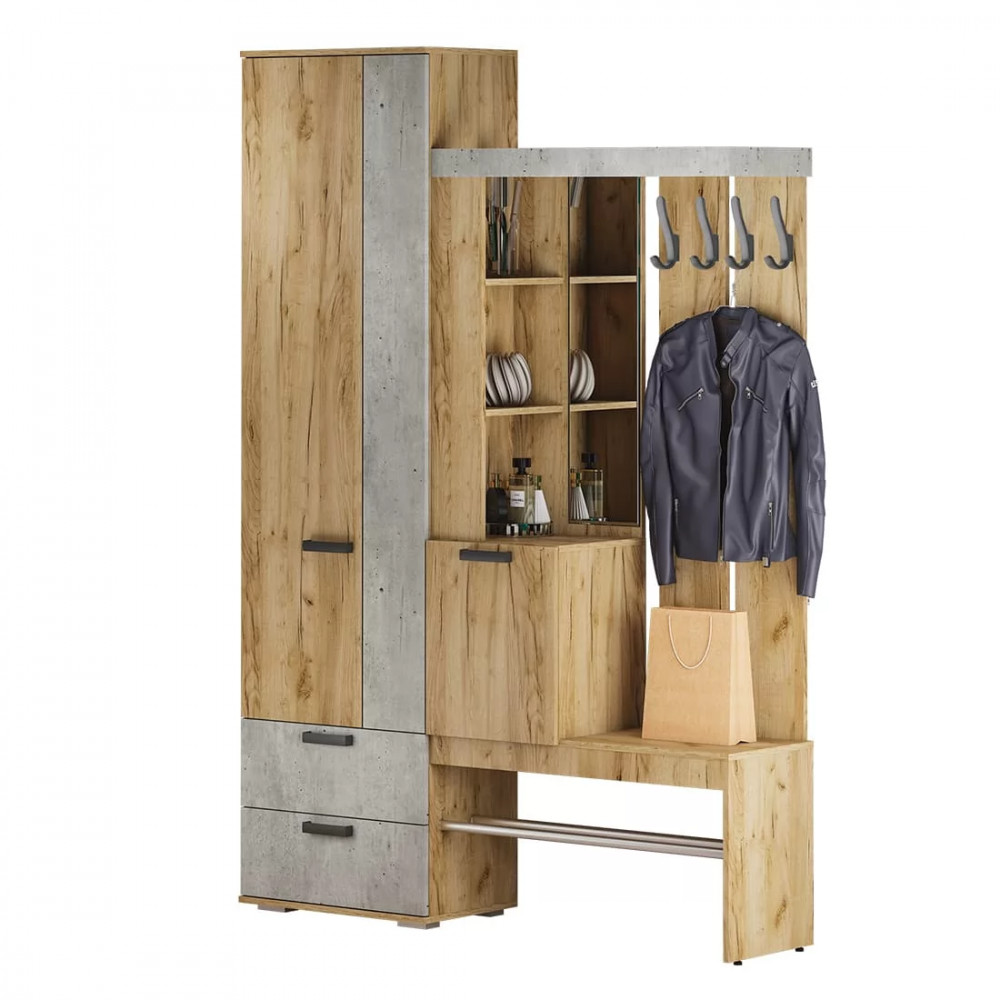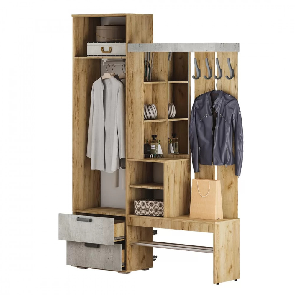 Идеальный выбор для современного интерьера, особенно в стиле лофт, – это прихожая Трамп. Модель выполнена из ЛДСП двух цветов – крафт и бетон. Изделие имеет все необходимые зоны для размещения вещей в прихожей: крючки для верхней одежды, открытые и закрытые ниши, шкаф с выдвижной штангой и зону для хранения обуви. Красивое и практичное решение по лучшей цене — это прихожая Трамп в компании «Семья Мебелони».