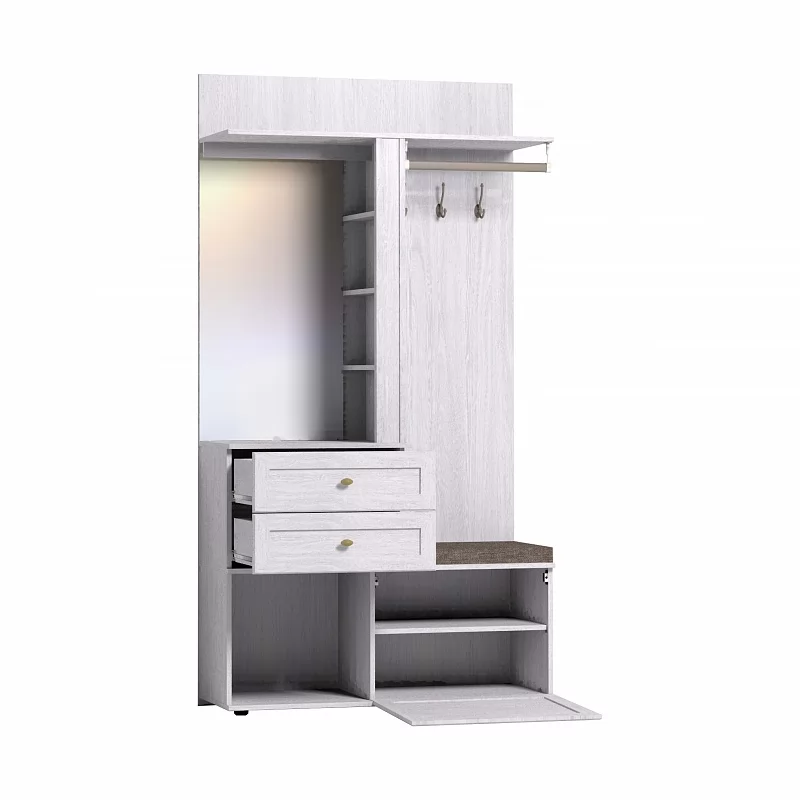 Это находка для маленькой прихожей. В небольшом по габаритам модуле сочетается всё необходимое: вешалки и крючки, полки и отделения за глухими фасадами, предусмотрено зеркало с подсветкой. Стационарная штанга на подвесах добавит вешалке Шкафа МЦН функциональности. Штанга на подвесах выдерживает нагрузку до 25 кг. Встроенная светодиодная подсветка включается при помощи аккуратного кнопочного выключателя. В модуле Шкаф МЦН предусмотрено место для хранения коробок и домашней обуви — просторная открытая ниша и ниша с полочкой за откидной дверцей на шарнирах. Дверца дополнительно фиксируется при закрывании магнитной защелкой. Регулируемые опоры помогут компенсировать неровный пол в прихожей. Ящик под аксессуары и косметику оснащен шариковыми направляющими полного выдвижения, что увеличивает полезную площадь ящика. Мягкое сидение, которое входит в комплектацию модуля, позволит обуваться с комфортом и сэкономить место в прихожей. Сборка Шкаф МЦН универсальная — его можно собрать как на правую, так и на левую сторону.
