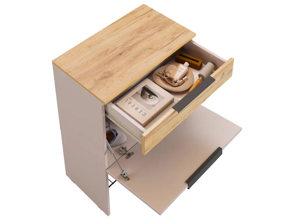 Большая секция для хранения открывается с помощью газлифта, что обеспечивает удобный доступ к содержимому и легкость в использовании. Сетчатая полка для обуви позволяет аккуратно разместить обувь, обеспечивая вентиляцию и удобство.