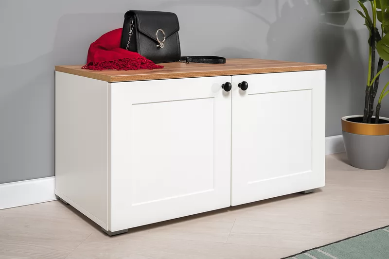 Прихожая доступна в двух цветовых решениях – белый/графит в сочетании с теплым древесным декором.