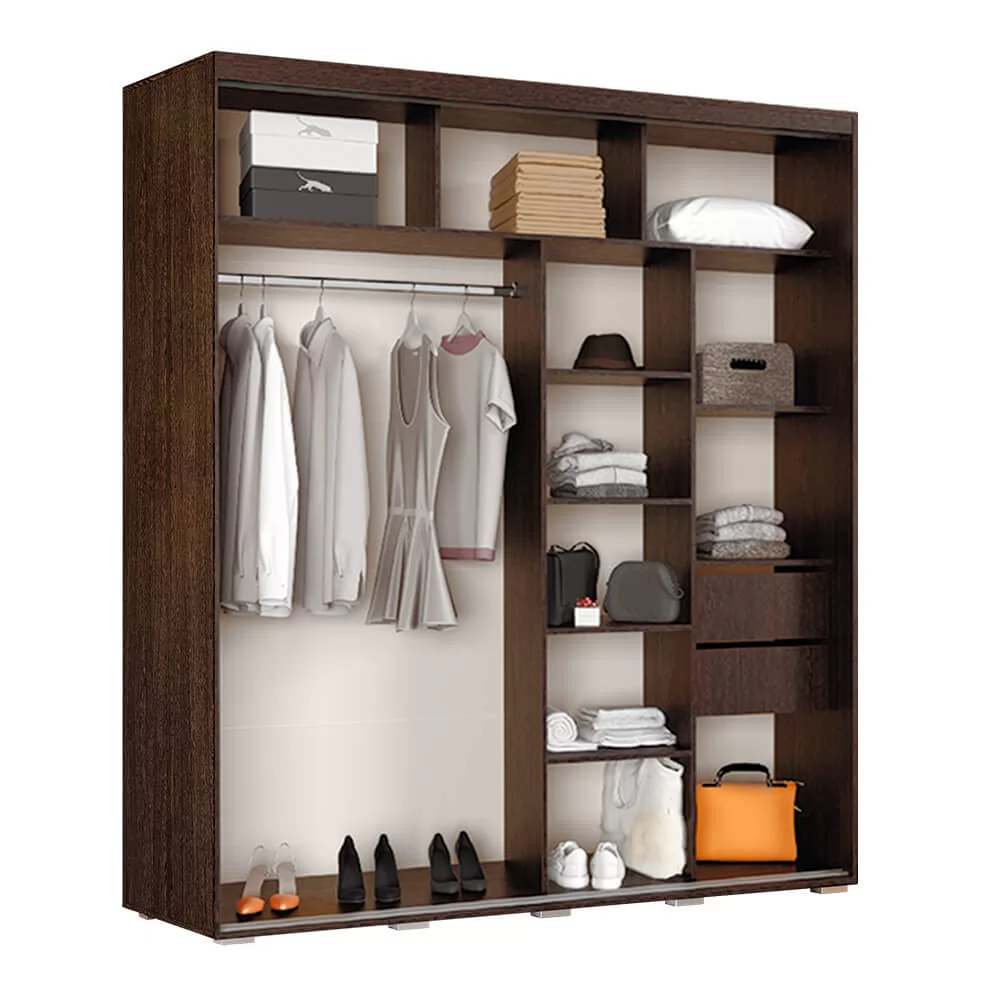 - модель изготовлена из ЛДСП, одна раздвижная створка выполнена из темного стекла, а вторая – зеркальная, - такой прием облегчает конструкцию и позволяет расширить пространство, - внутри модель состоит из многочисленных полок и ящиков для белья и одежды, - а также отделения со штангой для плечиков.
