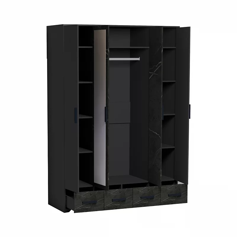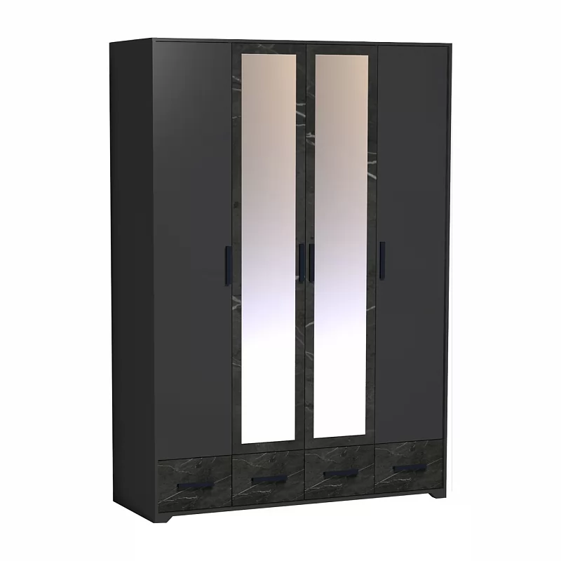 Четырехдверный шкаф для одежды и белья Айрис 555 с зеркалами и выдвижными ящиками - настоящая находка для большой и маленькой квартиры. Шкаф оснащен отделениями для хранения белья с полками на скрытых полкодержателях и отделением для одежды со стационарной штангой длиной 749 мм. Штанга выдерживает нагрузку до 40 кг. 4 выдвижных ящика комплектуются шариковыми направляющими. Такой шкаф с ящиками сможет заменить полноценный комод в маленькой спальне. Петли с доводчиками для бесшумного закрывания дверок шкафа.