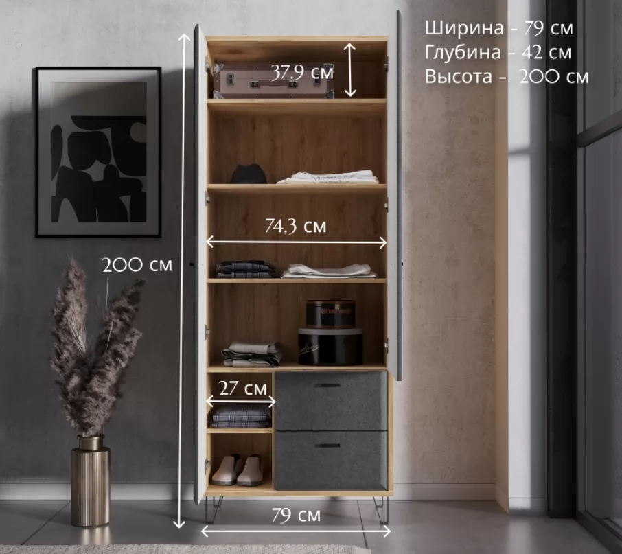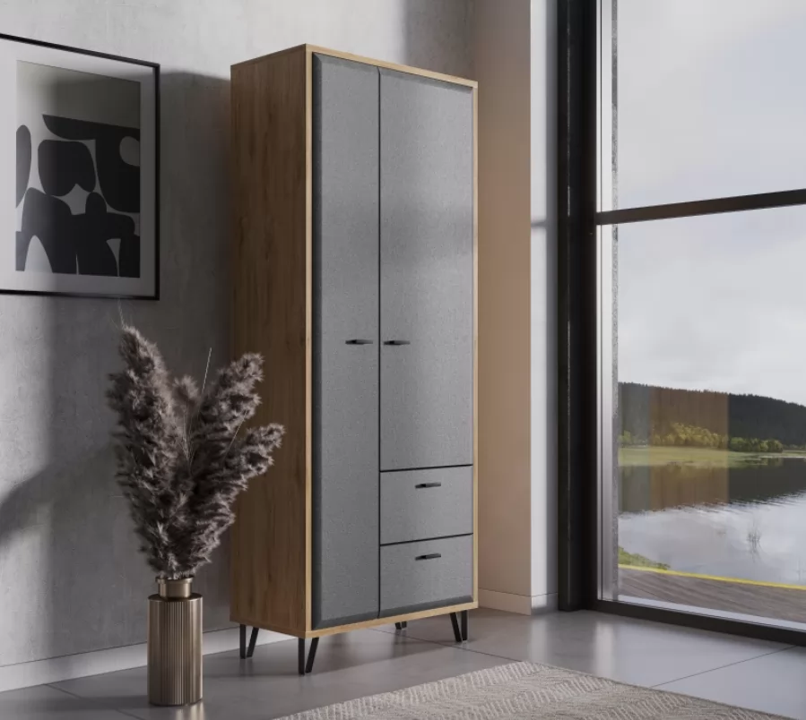 Двустворчатый шкаф Grace дуб наварра/графит SZF2D2S дополнит собой прихожую, спальню или детскую.