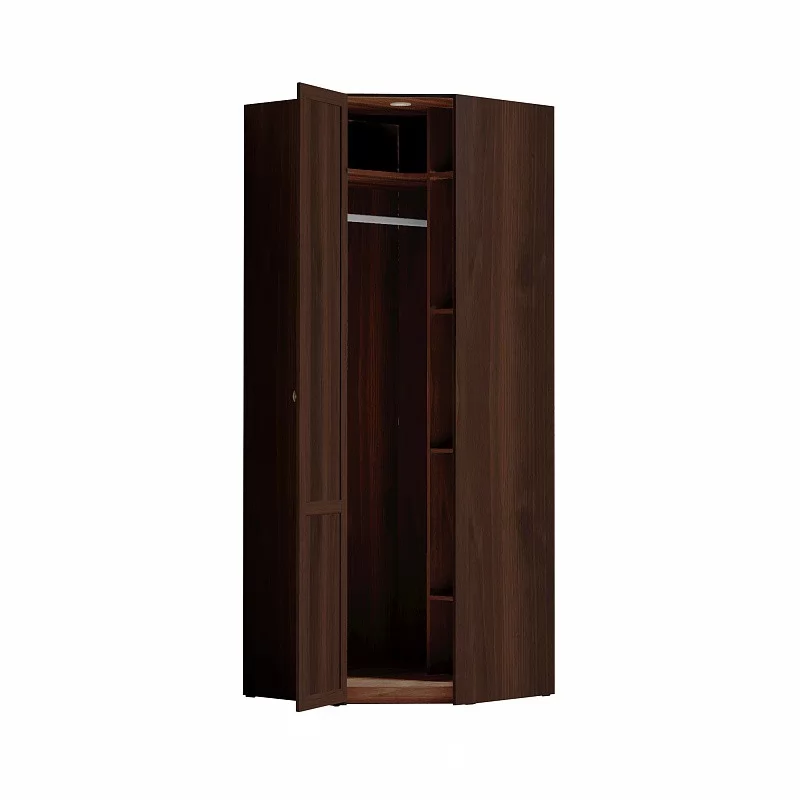 Угловой высокий шкаф использует рационально самую сложную площадь в комнате - угол. Он комплектуется внутренним стеллажом с регулируемыми по высоте полками и стационарной штангой для верхней одежды. Длина штанги 817 мм, что позволит свободно развесить более 10 плечиков с зимним гардеробом. Беспроводной светодиодный светильник поможет сориентироваться и быстро найти необходимое. Он включается только при открытой двери. Легкая установка светильника на магнитное крепление - не требует сверления, прокладывания провода, подключения к сети.