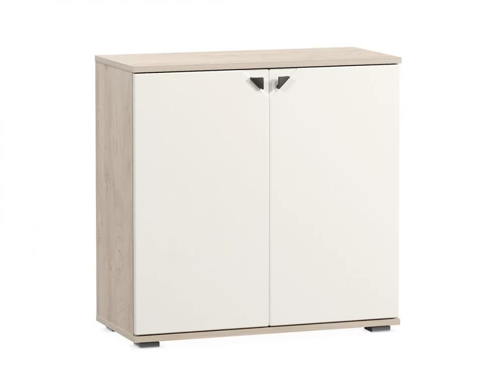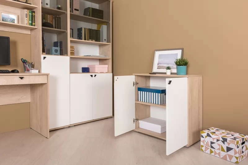Комод из модульной серии "Бостон" включает в себя секцию с двумя полками за двумя распашными дверцами.