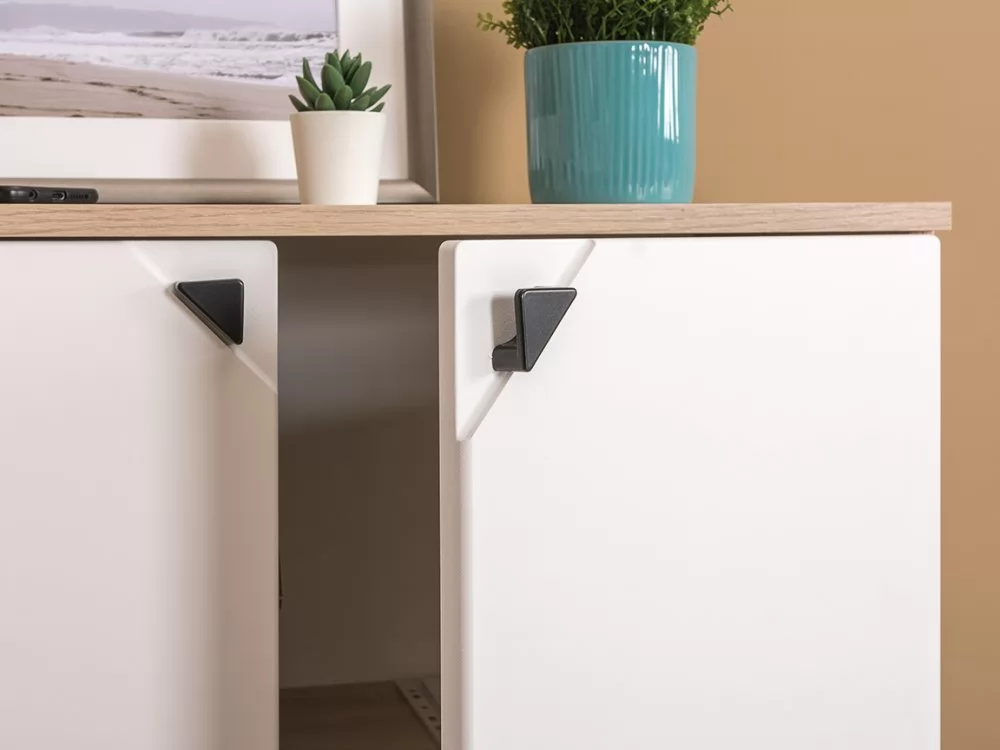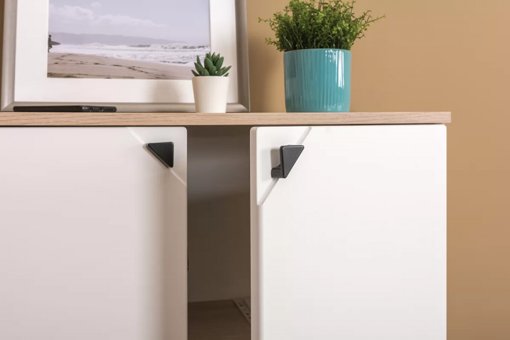 Минималистичная лицевая фурнитура выполнена в виде чёрных уголков-треугольников, которые чётко видны на белых фасадах и устанавливаются в специально выполненное углубление.