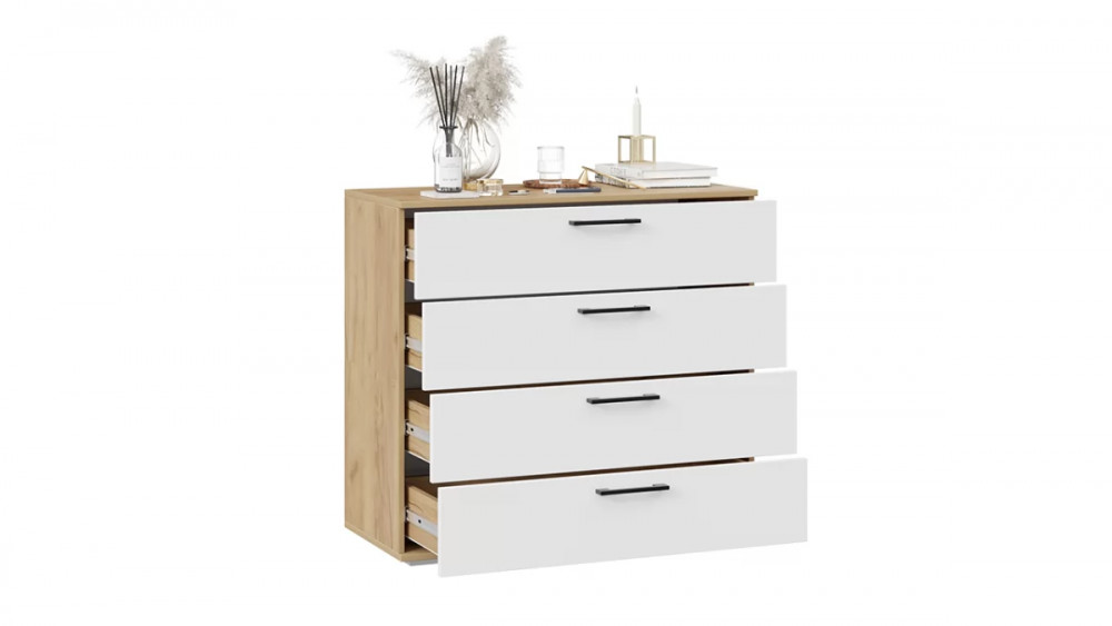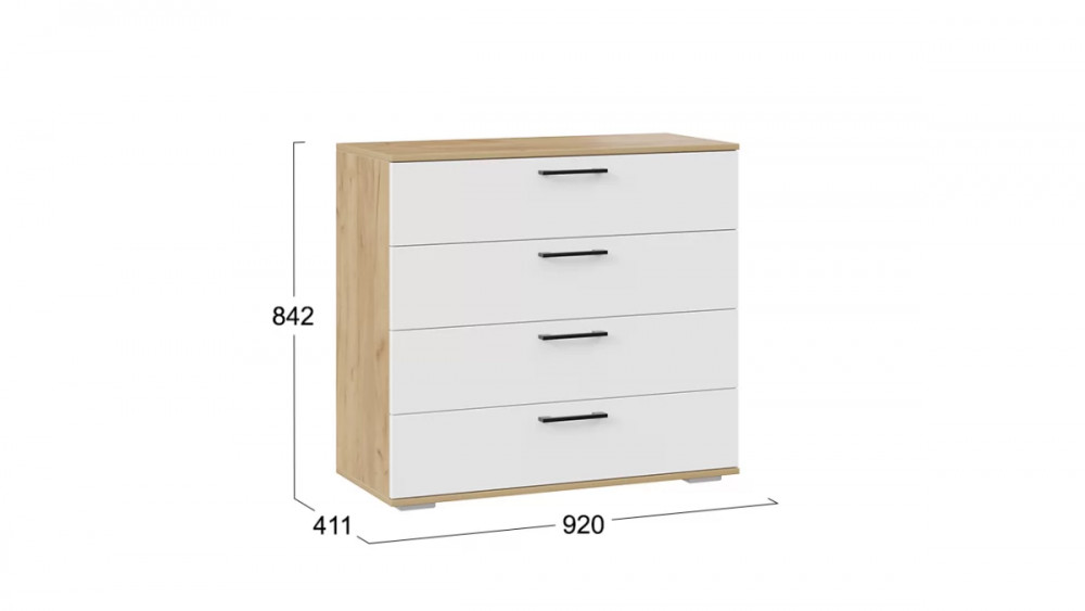 Назначение: Мебель для хранения Гарантийный срок: 24 месяца Комната использования: Спальня Материал кромки каркаса: ПВХ Цвет ручки: Черный Стиль: Современный Тип: Комод Расположение: Напольный Тип направляющих ящиков: Шариковые Материал каркаса: ЛДСП Материал ручек: Пластик Производство: Россия Габаритная ширина: 920 Габаритная высота: 842 Форма предмета: Прямоугольный Габаритная глубина: 411 Количество ящиков: 4 Модель: Нео Срок службы: 5 лет Материал фасада: ЛДСП Оттенок: Светло-коричневый, Белый Цвет: Дуб Крафт золотой, Белый Цвет каркаса: Дуб Крафт золотой Цвет фасада: Белый (поры дерева) Оттенок каркаса: Светло-коричневый Оттенок фасада: Белый Заглушина для ящика кровати в комплекте: Нет Наличие механизма раскладки: Нет Наличие спального места: Нет