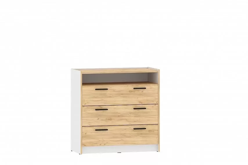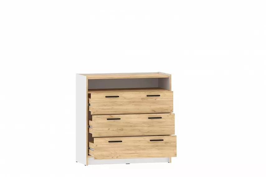 Комод оснащен четырьмя выдвижными ящиками, которые открываются плавно и бесшумно за счет шариковых направляющих, открытой нишей для удобного хранения вещей, а также представлен в двух размерах, чтобы точно уместиться в параметры вашей комнаты. Черные ручки комода гармонично контрастируют с песочным оттенком фасада.