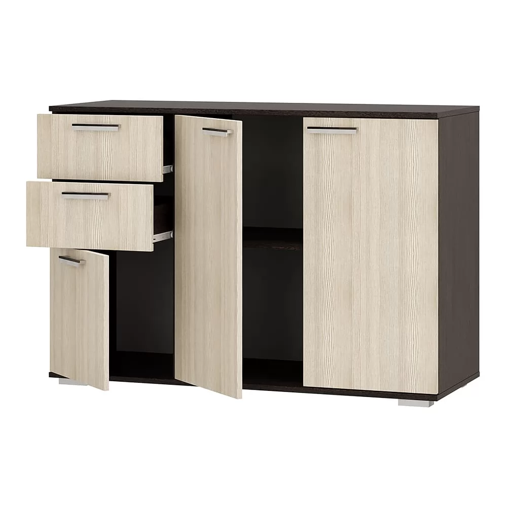 - основная часть изделия состоит из двух распашных дверок, за которыми находятся места для хранения вещей, - левая часть комода представляет собой два выдвижных ящика и нижнюю секцию также с распашной дверцей и полками, - модель Стандарт №3 выполнена из высококачественной ЛДСП в популярных оттенках венге и лоредо, - оснащена удлиненными хромированными ручками геометрической формы.