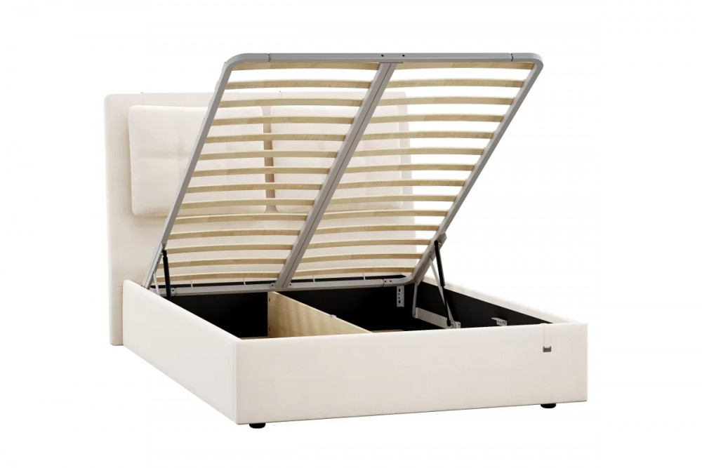 Подъемный механизм легок в управлении, а вместительный короб внутри кровати подойдет для хранения подушек, белья и других вещей.