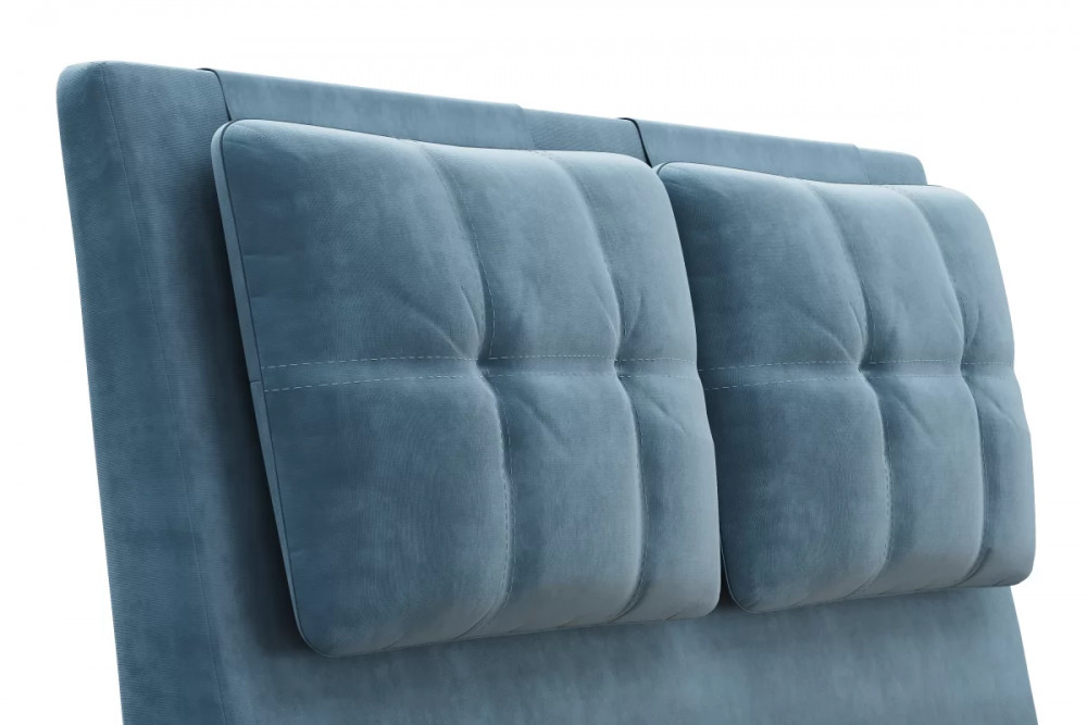 Кровати выполнены в нейтральных и в ярких тканях велюр, что позволяет подобрать подходящий вариант почти под любой интерьер. В качестве декора применяются декоративные подушки на изголовье.