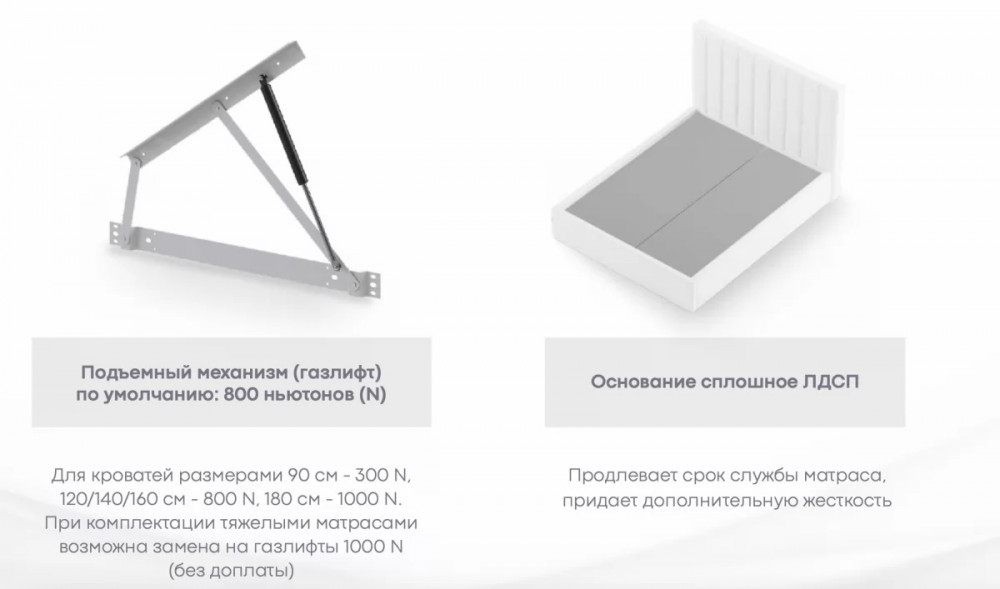 Имеет полный набор доступных опций: комплектация подъёмным механизмом, настилом, ортопедическим основанием.
