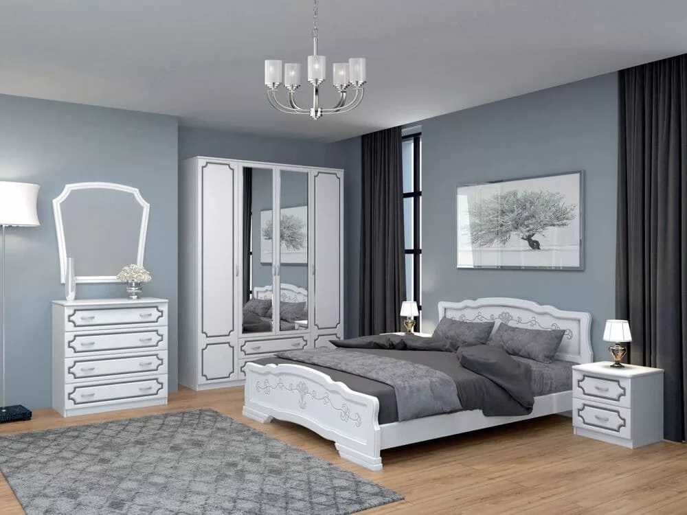 Белоснежность фасадов, элегантная отделка рисунком, классический распашной шкаф с зеркалом - так выглядит идеальная спальня. Нежный оттенок белого жемчуга делает комнату более просторной и светлой - универсальный вариант для любого стиля.